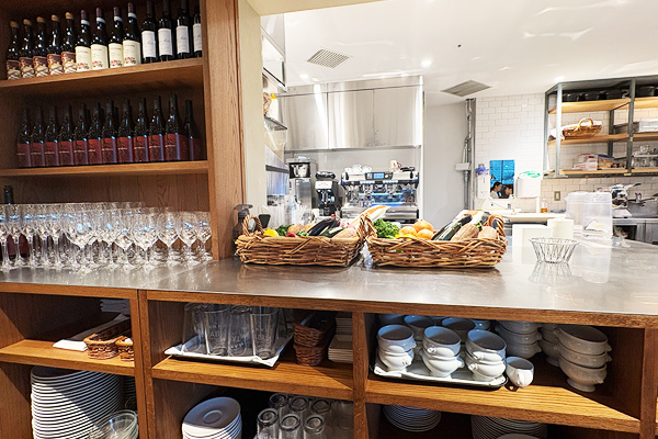 照明を落とした空間に、マーケットストアで並ぶ食材がガラス越しにのぞく。レストランでありながら市場の活気を感じる、不思議なライブ感が漂います。