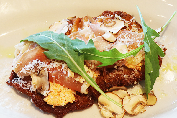 薄衣で軽やかに揚げたミラノ風カツレツ。チーズソースのまろやかさと、ふくどめ小牧場のクラテッロの塩味が重なり、柔らかな仔牛の旨みを際立たせます。ほろ苦いルッコラとマッシュルームがアクセントになり、食べ進めるたびに味の変化を楽しめました。