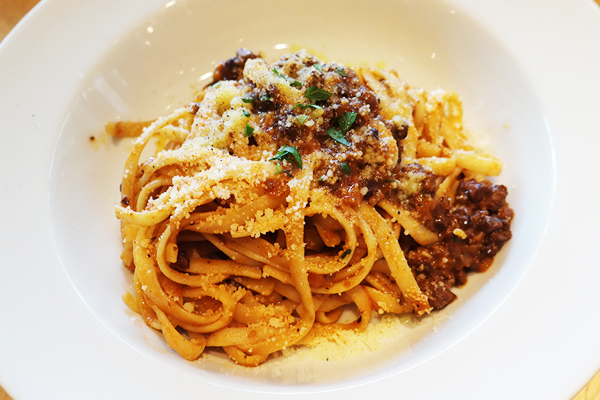 京都の精肉店「中勢以」が手がける京中式熟成牛を使用したラグーソース。旨みが凝縮された濃厚な味わいを、平打ちリングイネがしっかりと受け止めます。熟成肉ならではの奥深い余韻が印象的。