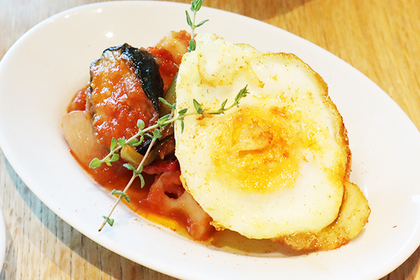 三田市の有機野菜をローストして仕上げたラタトゥイユ。添えられたフライドエッグを崩すと、黄身のまろやかさが野菜の甘みとトマトの酸味に溶け合い、味わいが一層奥行きあるものに。