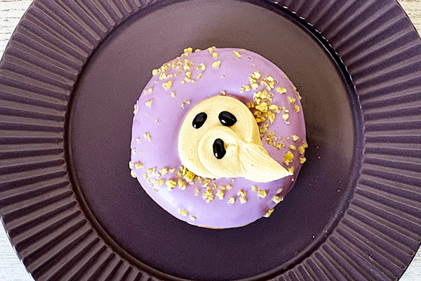 紫いもコーティングの艶やかなドーナツに、表情豊かなゴーストの顔が描かれた一品。