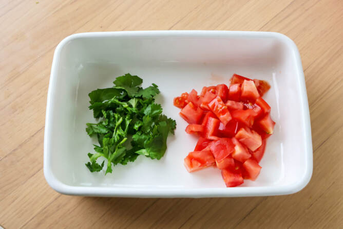 1. トマトは小さめの角切りにし、パクチーは適当な大きさに切っておく。