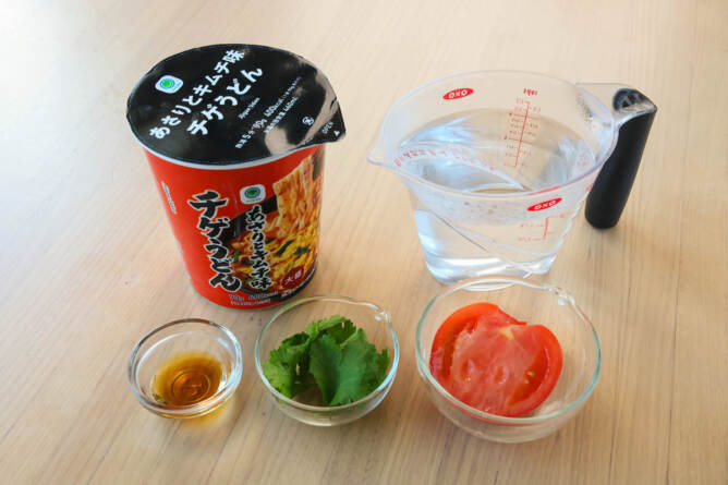 2. 「ファミマル あさりとキムチ味 チゲうどん」のカップの内側の線まで熱湯を注いで5分置く。