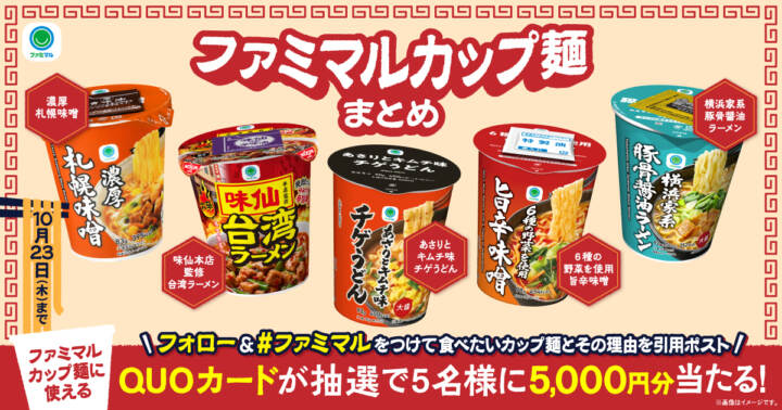ファミリーマート公式X(@famima_now)をフォローし、対象投稿に食べたいファミマルカップ麺と理由を引用ポストすると、抽選でQUOカード5,000円分(5名)が当たります。