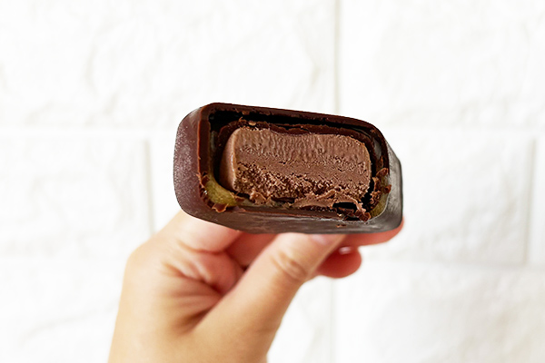 チョコレートコーティングが二層構造になっており、異なる食感のコントラストがとても楽しいです。
