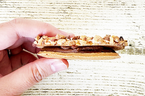 アーモンドとプラリネの魅力がこの1枚に詰まっています。アーモンドのザクザク食感と濃厚なプラリネの味わいが心地よいスイーツです。