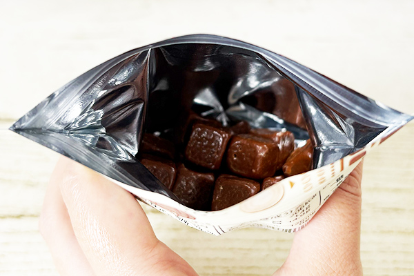 見た目は完全にミルクチョコ。噛むとパキッと割れる質感も口どけもチョコそのものです。