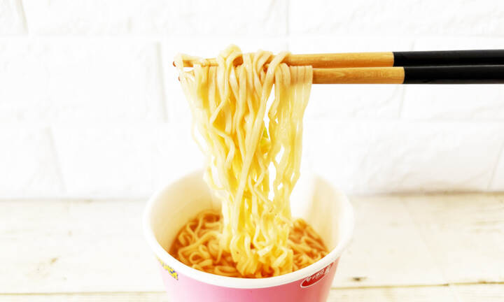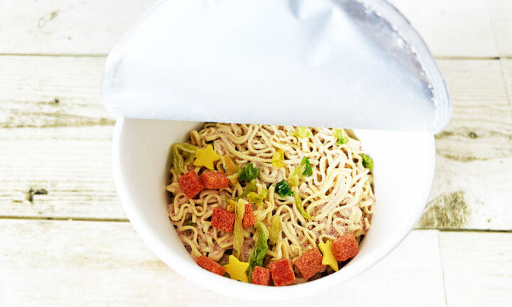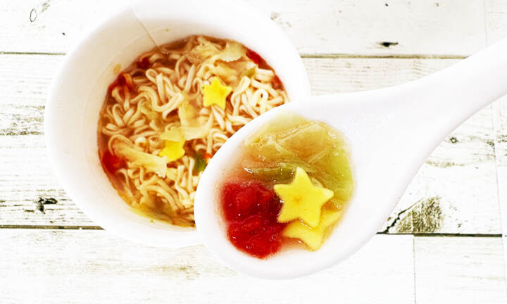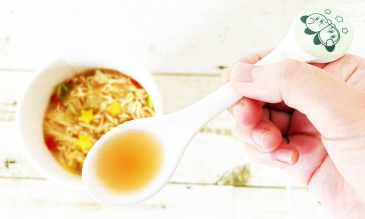 最後はカップ麺!トマトとチキンのクリーミースープに、星型かまぼこやキャベツ、トマトの彩りが楽しい一杯。まろやかなのに後味すっきりで、スープまで飲み干したくなる美味しさ。クリーミーなのに軽やか、カービィの世界らしい“やさしい味わい”が詰まっています。