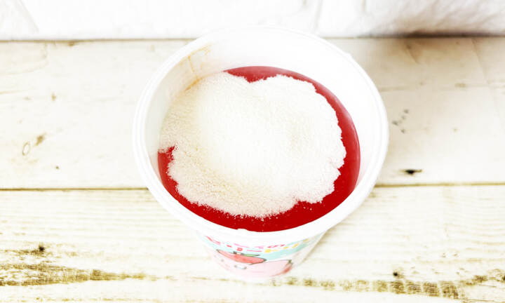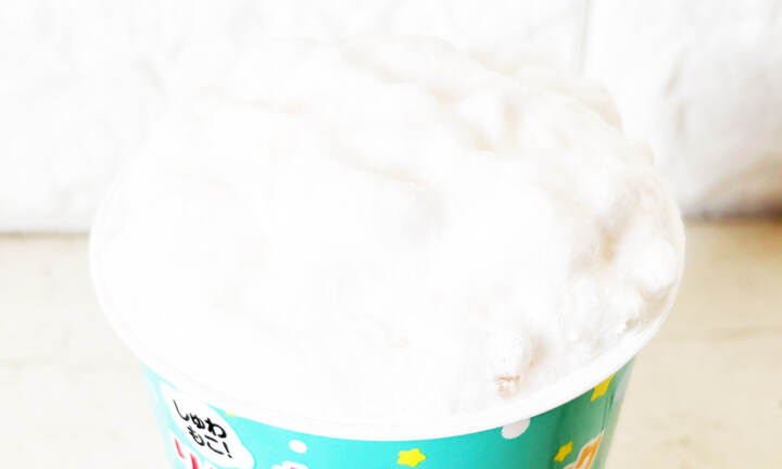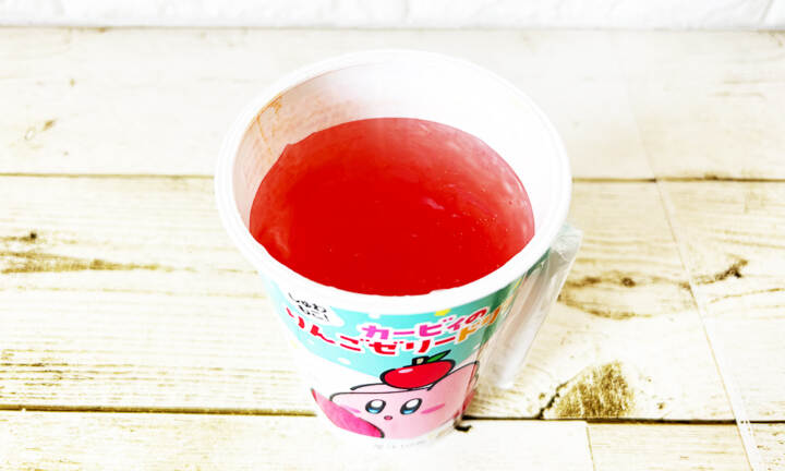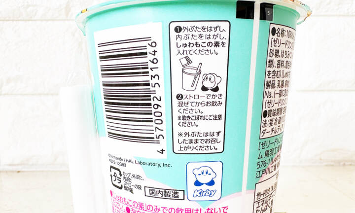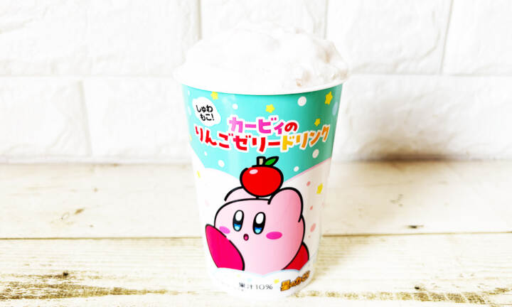 「しゅわもこの素」を混ぜると、もこもこと泡が立ち上がる楽しい一杯。まるでカービィの世界の“ふしぎな飲み物”みたい!りんごのやさしい甘さと、ゼリーのぷるぷる食感、そしてしゅわしゅわの爽快感がクセになります。パッケージは3種類で、推しカービィを探すのも楽しいですよ。