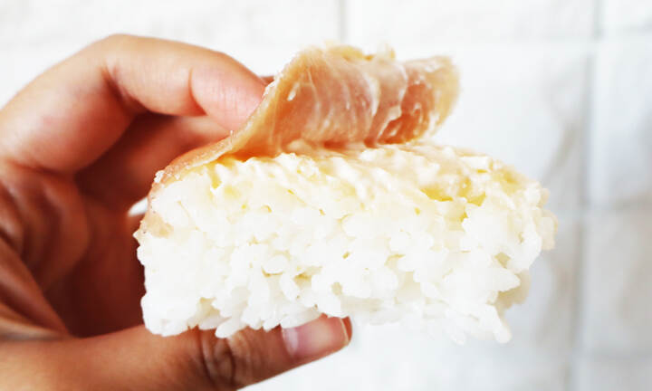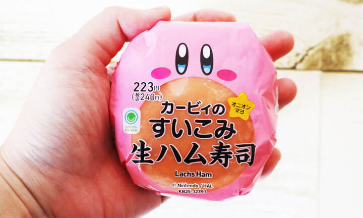 カービィが“すいこみ”中のようなパッケージを開けると、ピンク色の生ハムがふんわり。オニオンマヨソースが酢飯と合わさり、ほんのり甘じょっぱいバランスが絶妙です。マヨのコクとハムの塩味が効いていて、子どもも大人もペロリといけちゃう味。ビジュアルだけでなく味も“満足度”高めの仕上がりでした!