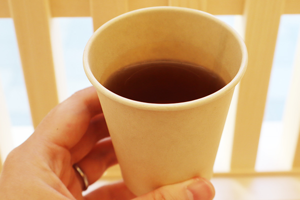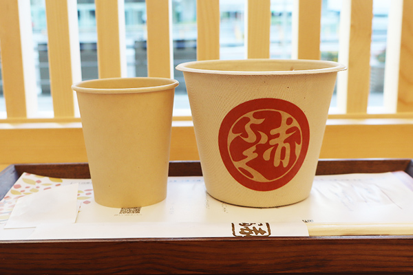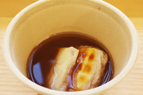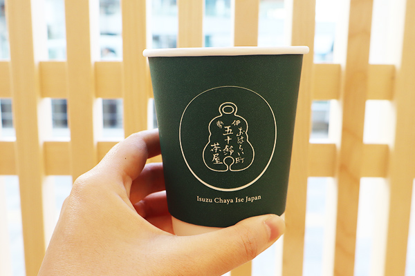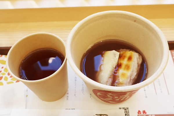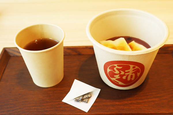 今回試食したのは、五十鈴茶屋でも人気の「赤福ぜんざい」。こちらではカップスタイルで提供され、思い立ったときに気軽に楽しめる形に。温かいほうじ茶と口直しの塩昆布がセットで付いてきます。